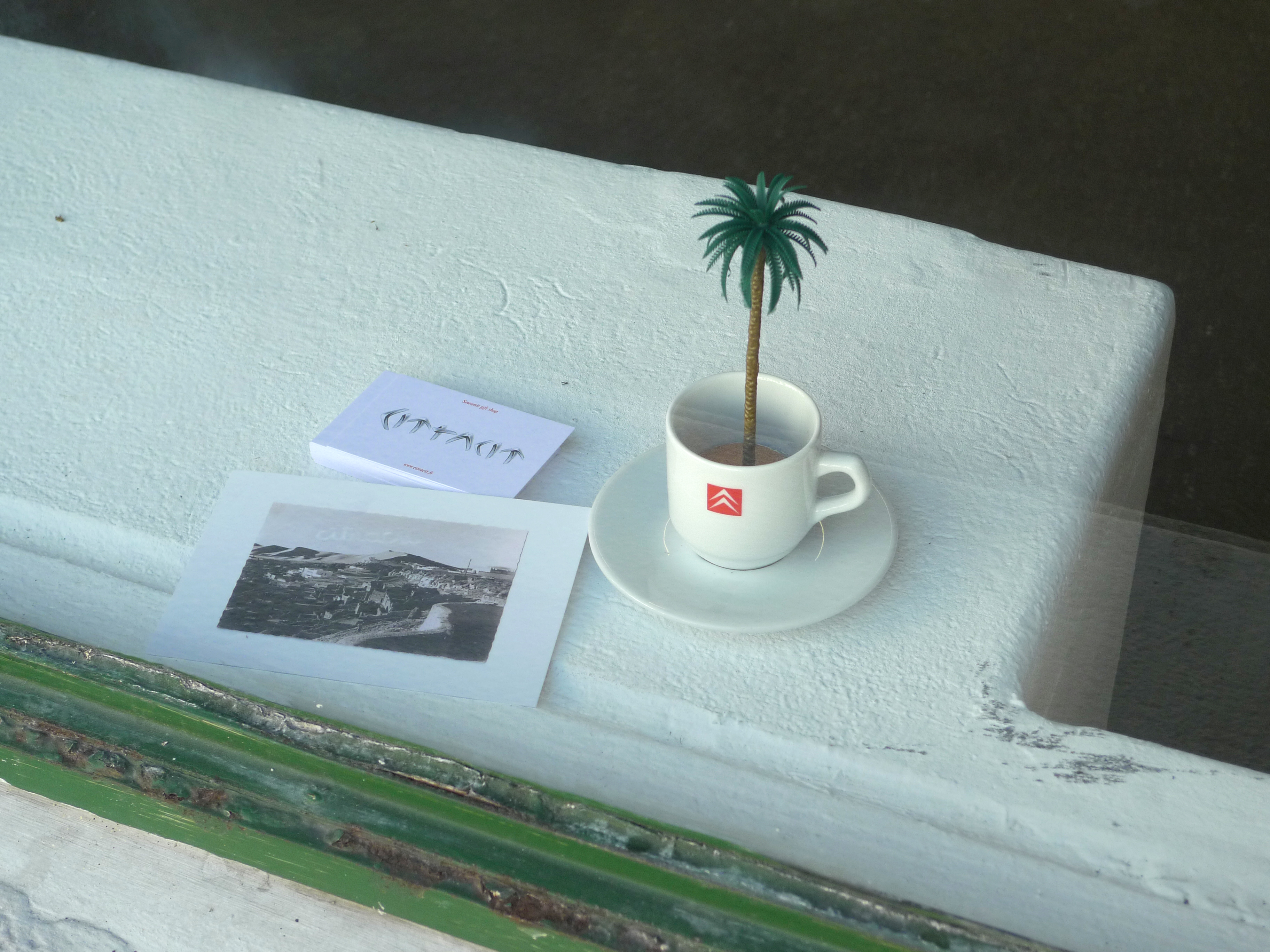 Sable du Sahara et palmier en plastique dans un service à café, 16.5 x 11 x 11 cm